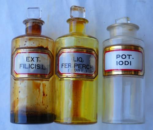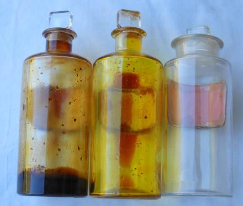 These bottles have not been washed and contain residues of their contents. One stopper is stuck.