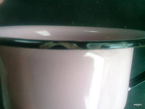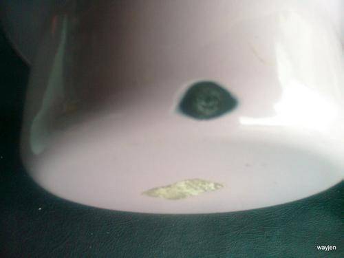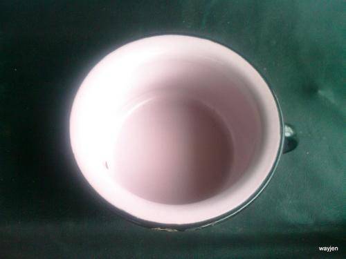 ENAMEL PINK AND BLACK CHAMBER POT. PLEASE NOTE:BURN MARK. AND SCRATCHES ON LIP.