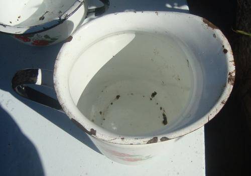 ENAMEL BATHROOM SET  PITCHER IS 25cm HIGH AS PER PICS.  PLEASE NOTE SOME DAMAGE AND ENAMEL LOSS  NO MARKINGS  POSTAGE R50.00