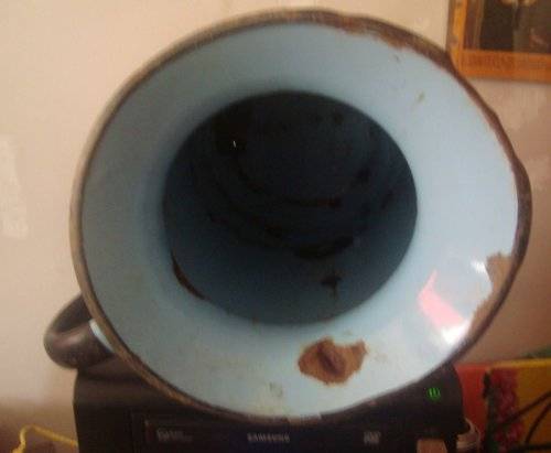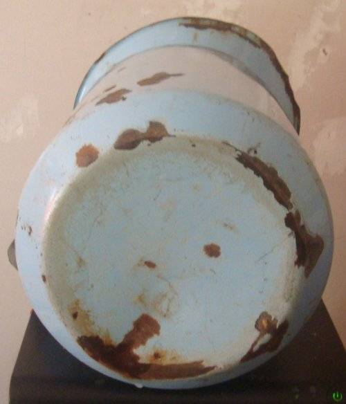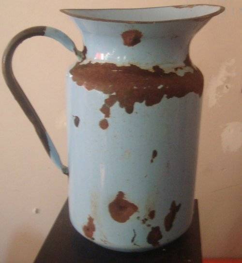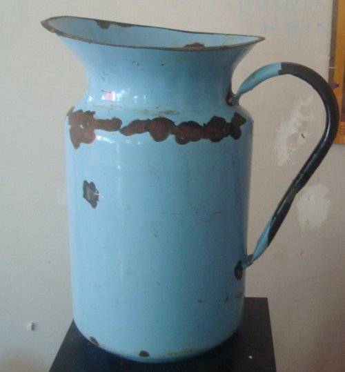 ENAMEL BLUE PITCHER  WELL USED WITH ENAMEL LOSS  ONE SMALL HOLE   SELLING AS IS  POSTAGE R60.00