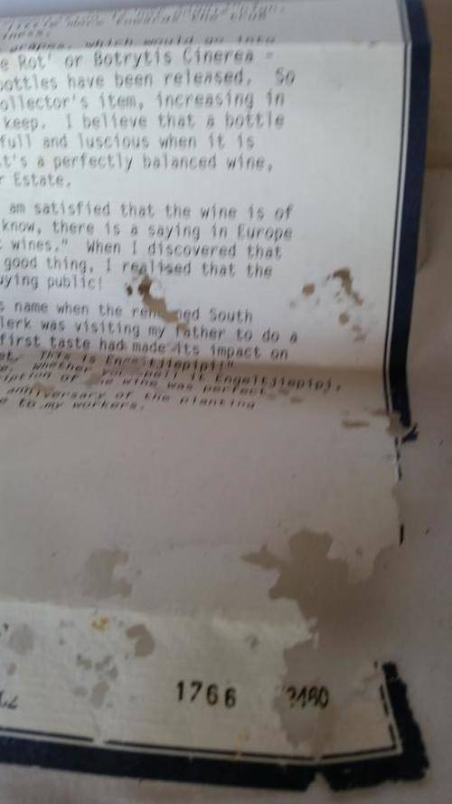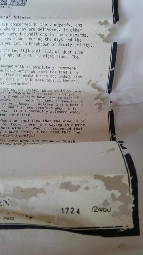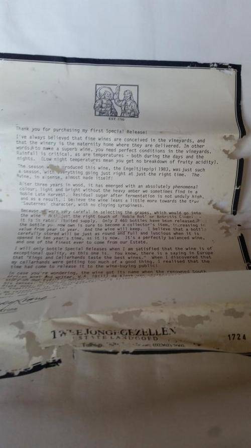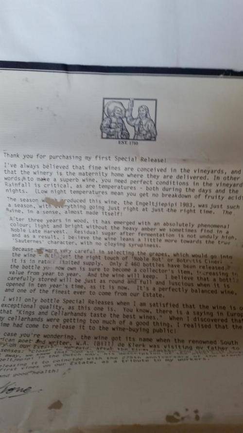 The wine is still in the original wooden box including a letter from Nicky Krone, the winemaker. The letter is a bit damaged by silvermoths.