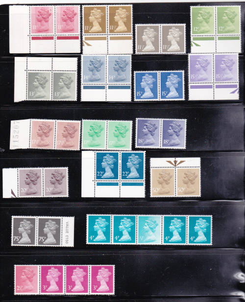ENGLAND, 1971 - 1980. Selection of mint, not hinged, Queen Elizabeth II to 75p, mostly with margin tabs and part arrow, stamps identified 1971, 1974, 1975, 1976, 1977, 1978 1980, Included is a pair of 1967 1/2d with PVA gum and two booklet strips. View scans for condition as it form part of the description, CV R ???. Note, display card not included, and the line across the images is due to the display card that we use to scan items. Such a selection is not likely found and is great for the Great Britain collector. One or two stamps has light spots on back.