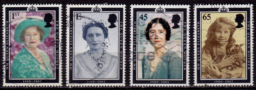 ENGLAND, 2002. H M Queen Elizabeth The Queen Mother. Full set, used, previously hinged. Hinge remains and light toning on back. View scans for condition as it form part of the description, CV +/-R 105.00. Note, display card not included, and the line across the images is due to the display card that we use to scan items.
