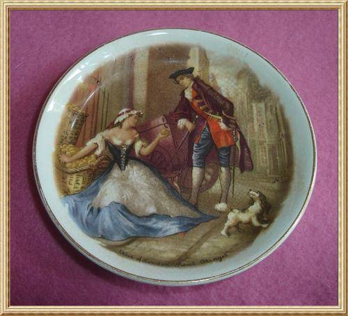 A lovely English porcelain " Cries of London Sweet Oranges " mini Plate, some wear to gold rim. 11cm diameter. Made in England.