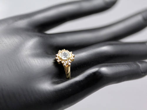 Very pretty ring with gentle colours and a feminine design that I bought from a favourite vintage jeweller in London. A round-faceted peridot solitaire is bezel set in 9ct yellow gold with 16 x small round cut natural white topaz gemstones claw set around the central peridot. The setting of the topaz creates pointed 'rays' surrounding the 'sun', and an open sides feature creates texture and interest. The ring head measures 10mm in diameter, the gemstones sitting fairly flat on the finger. The simple gold shank is narrow under the finger for comfort. It is well hallmarked, including the London Assay mark, the jeweller's signature, and the 375 hallmark indicating 9ct gold. The piece weighs 2,1 grams. A gorgeous pretty ring.