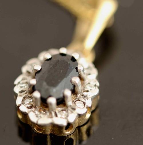 A classic vintage English design, this little pendant features a dark blue sapphire oval cut, 0,38 carats, set into 9ct yellow gold and framed by 9ct white gold into which 10 small round cut diamonds have been claw-set. The bale and the chain are also 9ct yellow gold. It is a very simple design, quite dainty, and elegantly classy. A lovely touch is that the jeweller has crafted little "die-cuts" into the side of the pendant through the gold in order to let the light through. The pendant measure 18 mm from the top of the slender gold bale to the bottom of the pendant and 10 mm if you measure the pendant excluding the bale. The pendant width is 8 mm. I bought the necklace in London but in fact it heralds from Birmingham and dates back to 1989. The pendant has lots of hallmarks including the British crown, 375 for 9ct gold, the Birmingham assay and the date mark. The fine gold chain also bears the hallmarks for 9 ct gold. A classic collectable! Please read the specifications as the photographs do make the pendant look bigger than it is in real life and the chain looks thicker.
