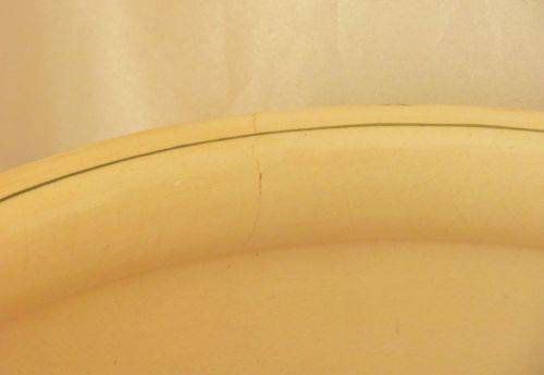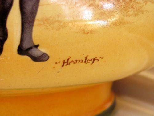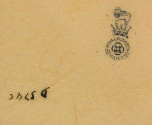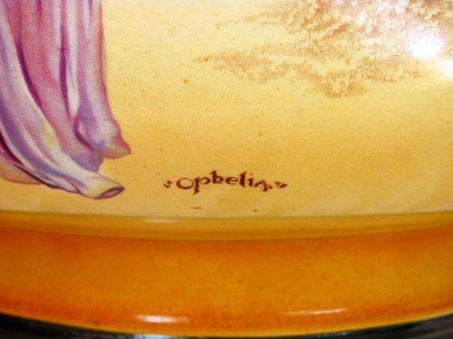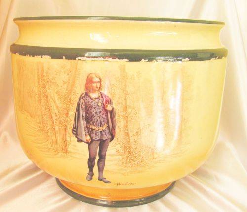 Manufacturer Royal Doulton Variant Large Jardiniere Pattern Hamlet and Ophelia Backstamp period 1930's Markings [Lion][Crown] Royal doulton D3746 Diameter 310mm Height 265mm Weight 5.67kg Chips None Cracks Yes, 5 hairline to rim Crazing Yes Staining Some, Minor Pattern wear Low Wear The green rim around the outside diameter has numerous flakes. Postage Surcharge R50.00