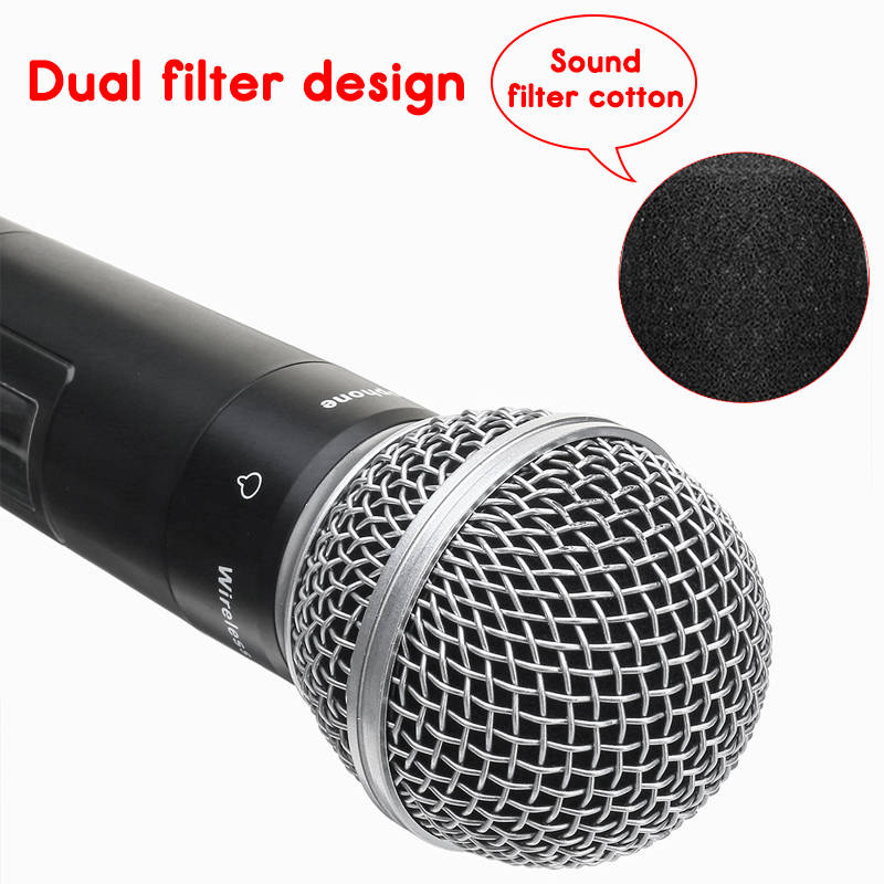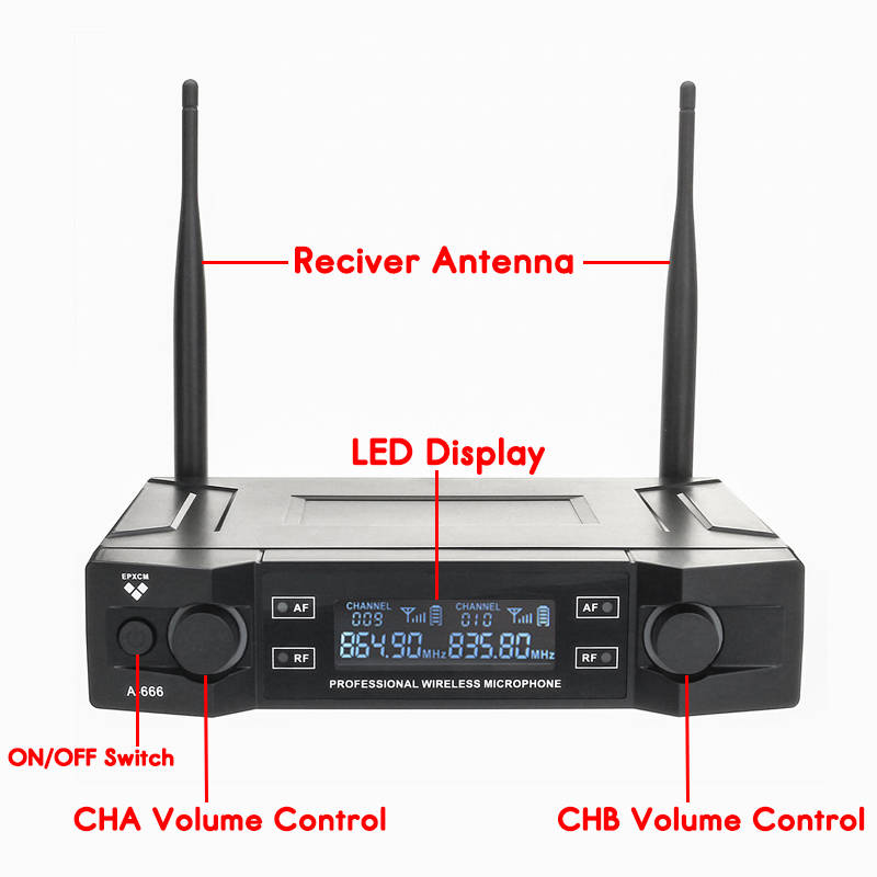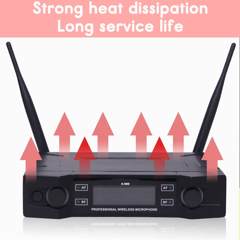 Wide frequency response--- digital control circuit.Resist disturbing strongly, be standing by noises output to 0. Super silent function, low T H.D. So the bass is rich, mediant is brightness and all is clear. No hitting when putting on the switch, so can protect the amplifier and speakers. With a complete working state and hand-holded microphones power level indicating.(The signal lamp shine continuous that to replace the battery.) A double-way channels designed, two hands holding each two microphones at the same time to sing without any disturbing caused by. Series output circuit design that can connect with two or over two adjustment audio stage or amplifier system. Uniform cardioid pickup pattern isolates the main sound source and minimizes background noise. Effective, built-in spherical resisting wind and filter in microphone system. Choose high quality pickup and components, so that its timbre will be very good. With audio compressing-expanding technology, the machine can lower noises and increase the dynamic range. The receiver use the field effect of the enlarge and the superhigh sensitivity, so it has high sensitivity. Used in the entertainment places as a larger and a middle stage, karaoke hall or at home etc.
