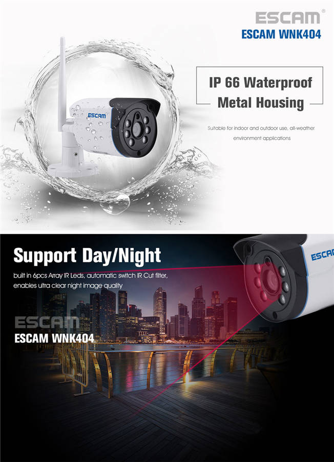 WiFi connection, no wiring work, no router forwarding settings. Plug in and play, installation very easy and simple. WiFi range up to 50 meters. Dual antenna wifi NVR. IP66 waterproof metal housing. Support Day/Night. Support motion detection. Support mobile control.
