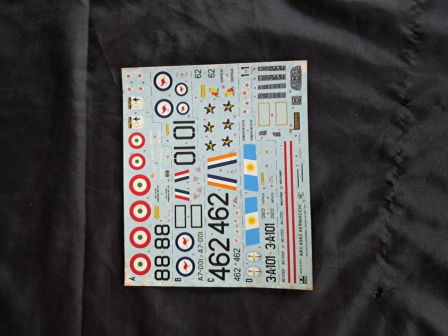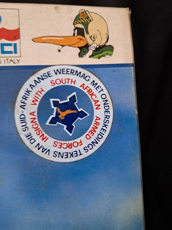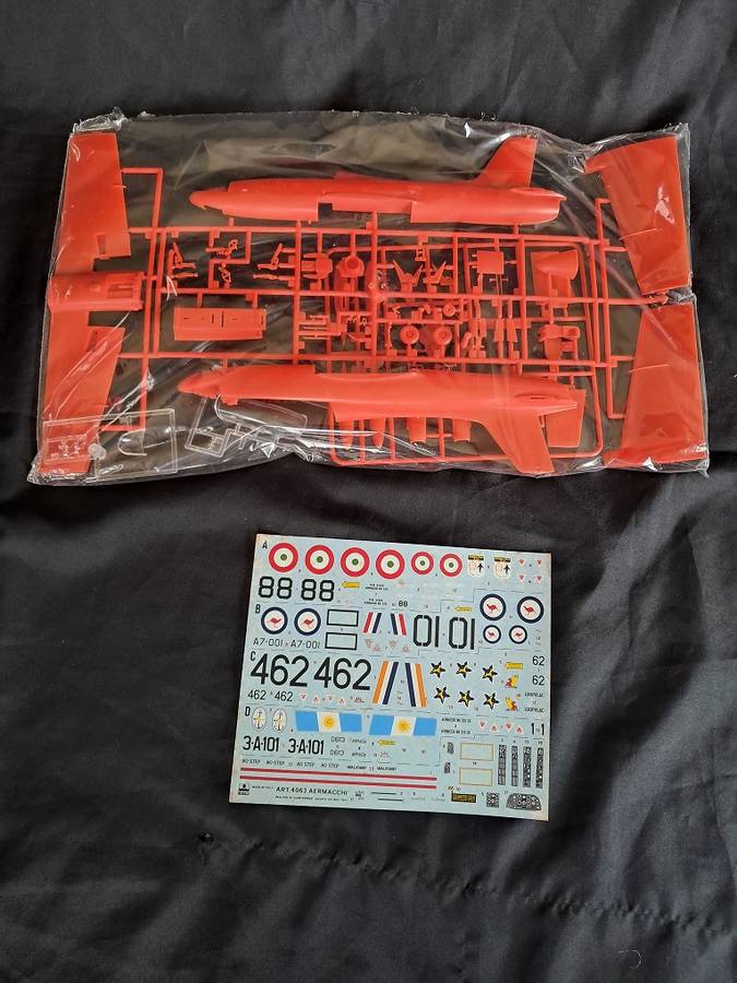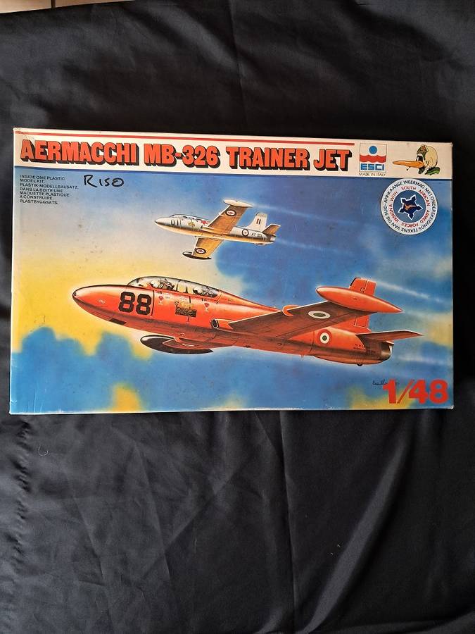 ESCI 1:48 scale Aermacchi MB-326 Trainer Jet model plane kit - 4063. This model plane kit dates to the 1980s. This particular kit is the version with the South African Armed Forces insignia included in the decals. The box has been opened, but all the pieces are still sealed in their original inner factory packaging, but it does not have construction directions pamphlet. Great buy for the collector.