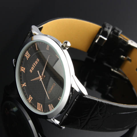 ESS BLACK FACED MENS WATCH SLIM LINE WITH BLACK LEATHER STRAP