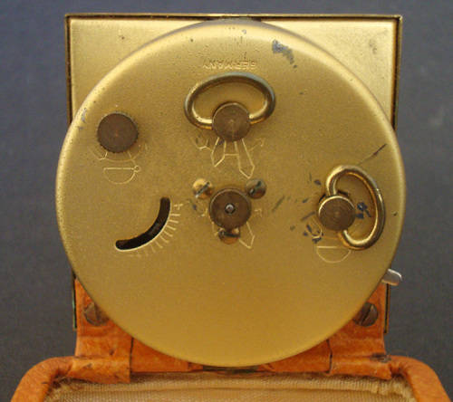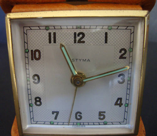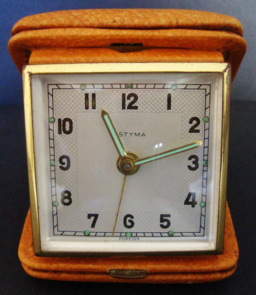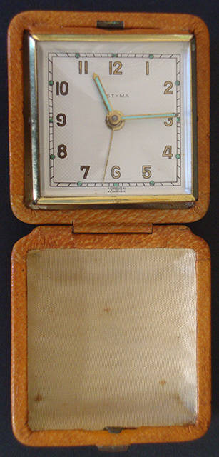 ESTYMA FOREIGN VINTAGE WIND UP TRAVEL ALARM CLOCK IN LEATHER CASE MADE IN GERMANY