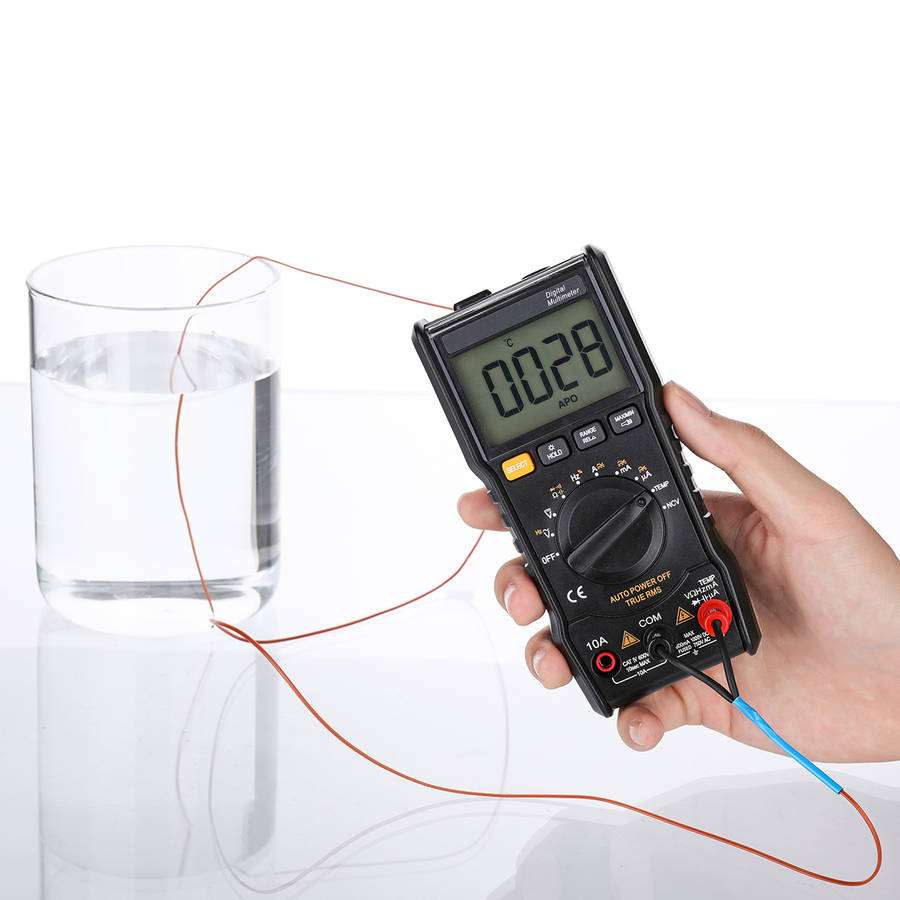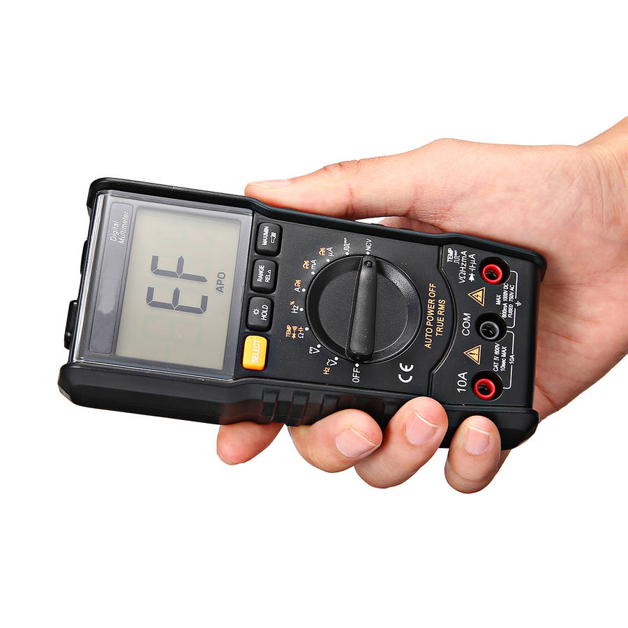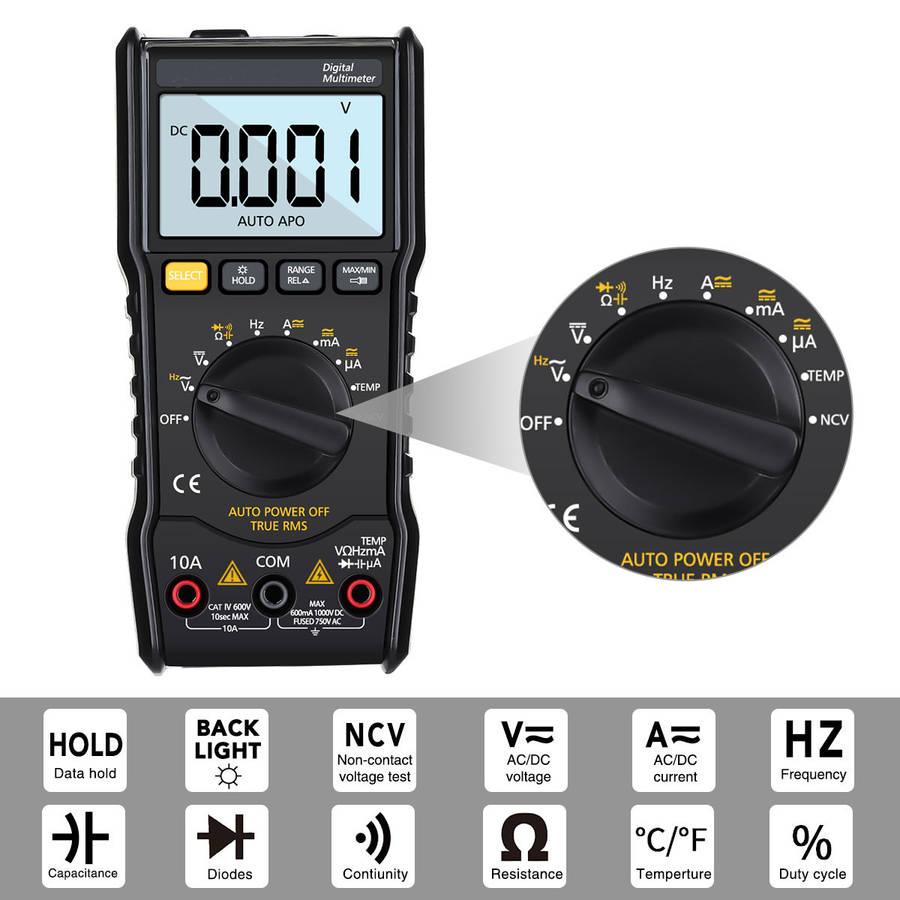 LARGE RANGE MEASURING - 6000 Counts, DC Voltage to 1000V, AC Voltage to 750V, AC/DC Current to 10A, Resistance to 60M, Capacitance to 100mF, with type K thermocouple to measure the temperature, continuity test