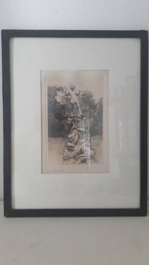 Offered for sale is an original signed etching by listed British artist Leslie Austin (1880-1936) and dating to approximately 1924. This is a hard ground dry point etching made from an engraved metal plate . The image depicted and celebrated is of the famous Peter Pan sculpture in Kensington Gardens in London. The original sculpture in bronze was made by the artist Sir George Frampton and was commissioned by the author JM Barrie to promote his popular novels featuring the character Peter Pan a young boy with magical powers who never grows up. The novel The Little White Bird by JM Barrie includes a scene where Peter Pan in a nightshirt escapes from his nursery and flies to Kensington Gardens. Leslie Austen depicts Peter Pan in a night shirt playing a flute or trumpet and standing atop a trunk or log shaped base teeming with rabbits, squirrels and fairies. The original sculpture was installed secretly at night at Kensington Gardens on 30 April 1912 followed by an announcement in the Times newspaper to promote the event and the novels. The etching is in good condition framed behind glass with the original ebonized wood framed.