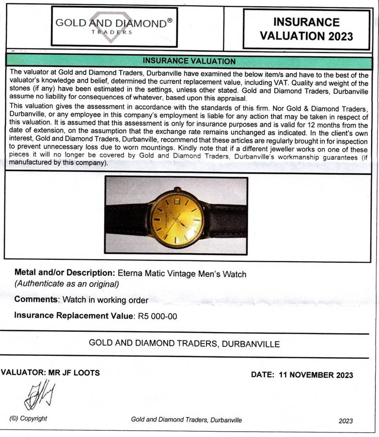 According to the valuation certificate, the watch is authenticated as an original and in working order. The replacement value is R5 000.00.