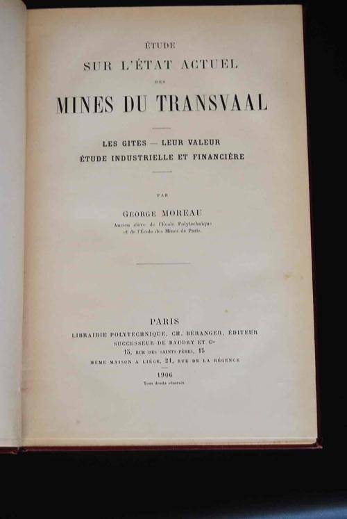 TITLE: ETUDE SUR L'ETAT ACTUEL DES MINES DU TRANSVAAL PAR GEORGE MOREAU 1906 DESCRIPTION: HARDCOVER STILL GOOD AND FIRM AS IN PHOTO , SOME EDGE WEAR WITH PREVIOUS OWNER'S BOOKPLATE FEEDBACK: I TYPICALLY WAIT UNTIL ITEM IS RECEIVED BY THE WINNING BIDDER PRIOR TO POSTING FEEDBACK. THIS ALLOWS BOTH PARTIES TIME TO RESOLVE ANY ISSUES THAT MAY ARISE WITH ANY GIVEN TRANSACTION. POSTAGE: PLEASE REMEMBER TO ADD POSTAGE AMOUNT WHEN MAKING PAYMENT |