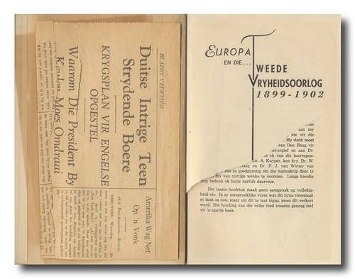 Europa en die Tweede Vryheidsoorlog 1899-1902 deur GD Scholtz. A5, hardeband, 224 bls. Buiteblad effens verweer veral bo en onder aan rugkant asook hoekies. Titelblad se onderste deel is afgeskeur. Verskeie koeranrberigte voor in boek, sommiges is ingeplak. Verskeie bladsye met potlood gemerk. Boek in goeie leesbare toestand.