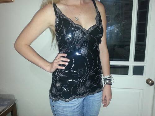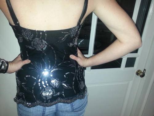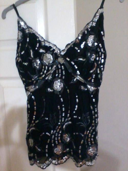 Stunning evening top, black and silver with a lovely pattern, imported from UK, worn once. Size ten, lined 65% cotton, 35% polyester.