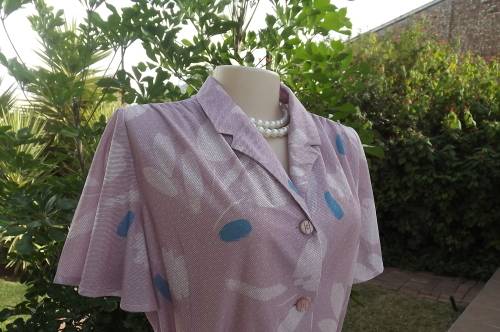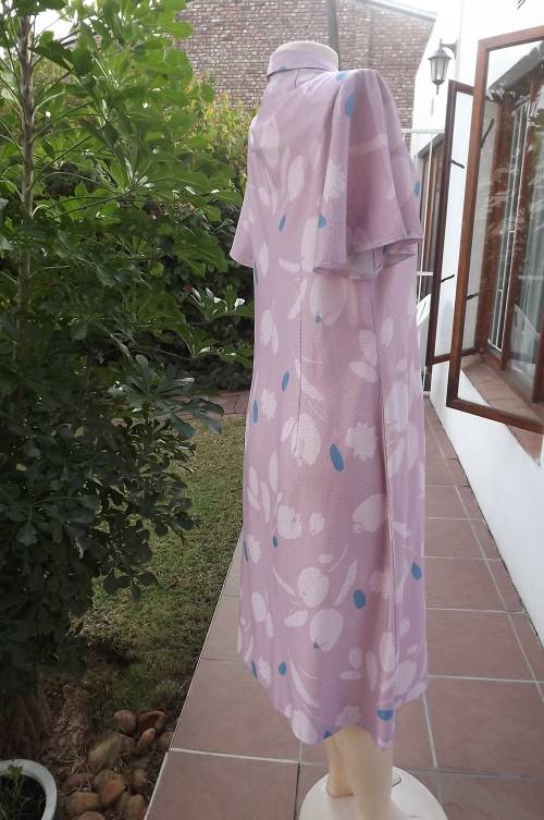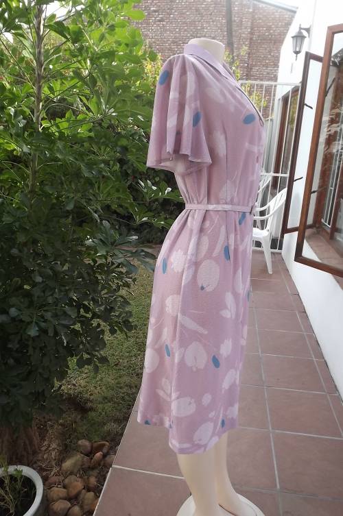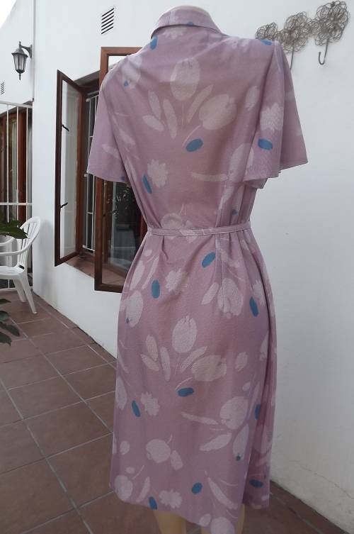 Excellent quality dusty pink dress by "Nina" size 42/18. 100% cool polyester fabric with touches of blue.Button down halfway.Belt included.
