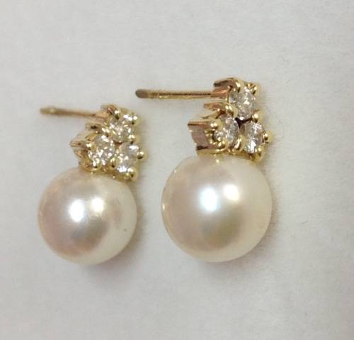 Three genuine Diamonds (each 4 pointers) in each earring perfectly accent the lustre of the beautiful round Freshwater Pearls.