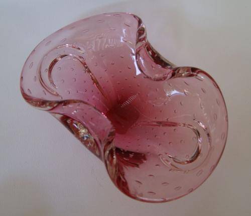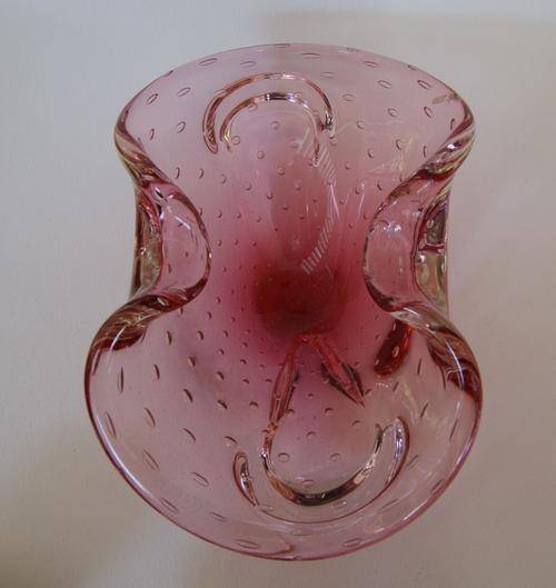 the luminous shimmer produced by the multitude of tiny bubbles embedded in the solid salmon pink glass.