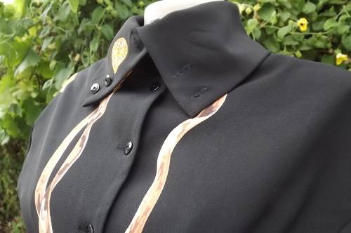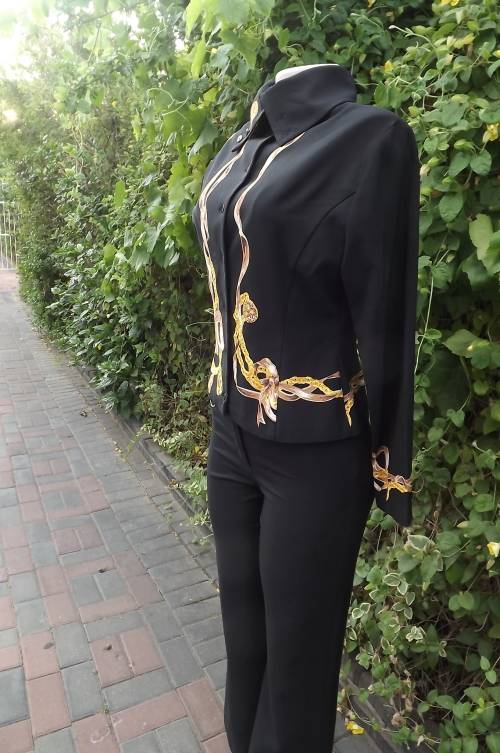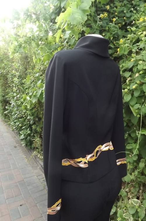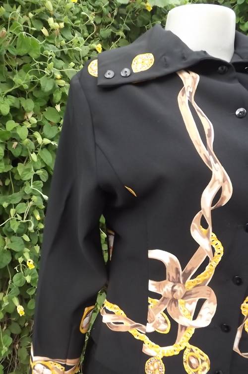 Exceptional short styled jacket in black with gold chain and ribbon print.Size 32/8 from Japan.Polyester stretch fabric.High fold over button down collar.New condition