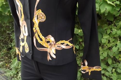 Exceptional short styled jacket in black with gold chain and ribbon print.Size 32/8 from Japan