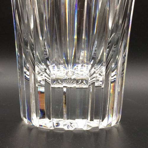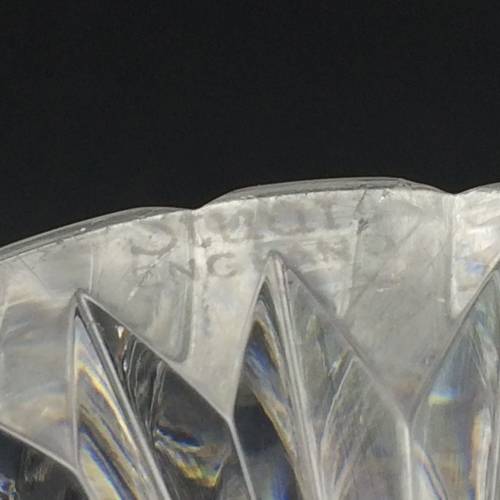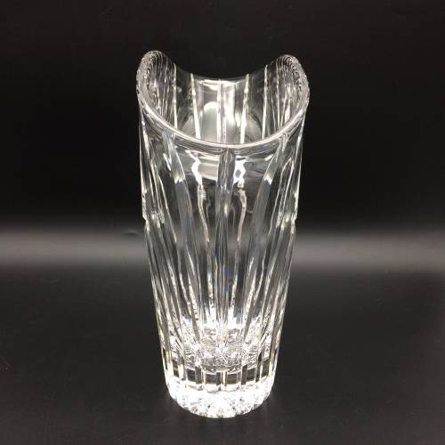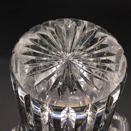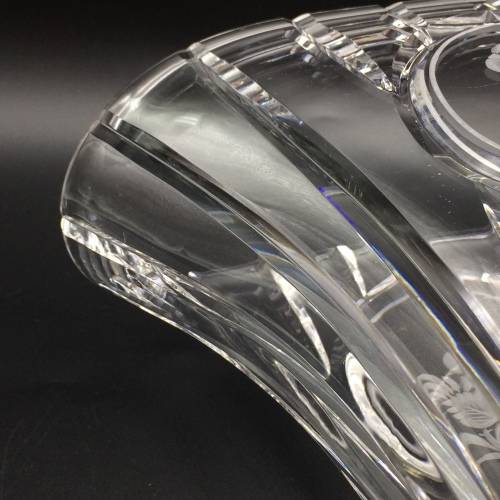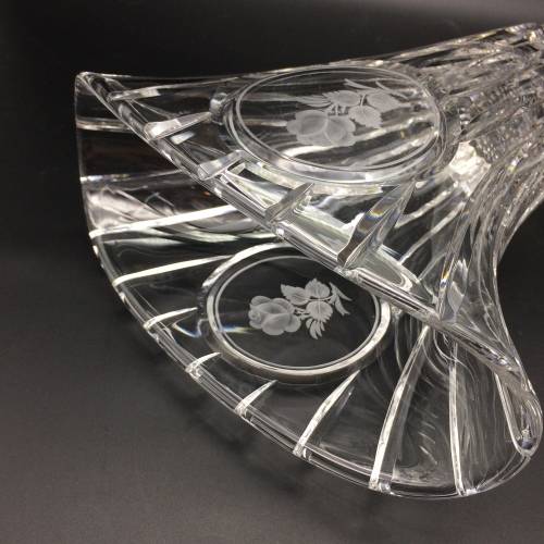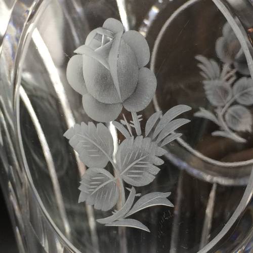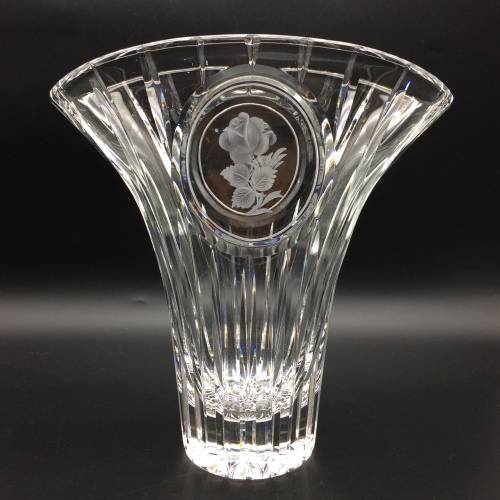 This magnificent, large crystal vase is in superb condition and is honestly one of the nicest Ive come across in thirty years of trading. It was manufactured around the 1950/60s by the 'Stuart' crystal factory in England, who were well known for their top-quality pieces. The vase is fan shaped, with deep cut vertical lines and decorated with a beautifully etched rose in a clear, round panel on each side. The crystal is very clear and has a nice weight to it and is marked 'Stuart England' on the base. It stands 24cm high, with a width of 22.5cm and a depth of 9.5cm.