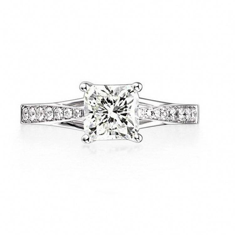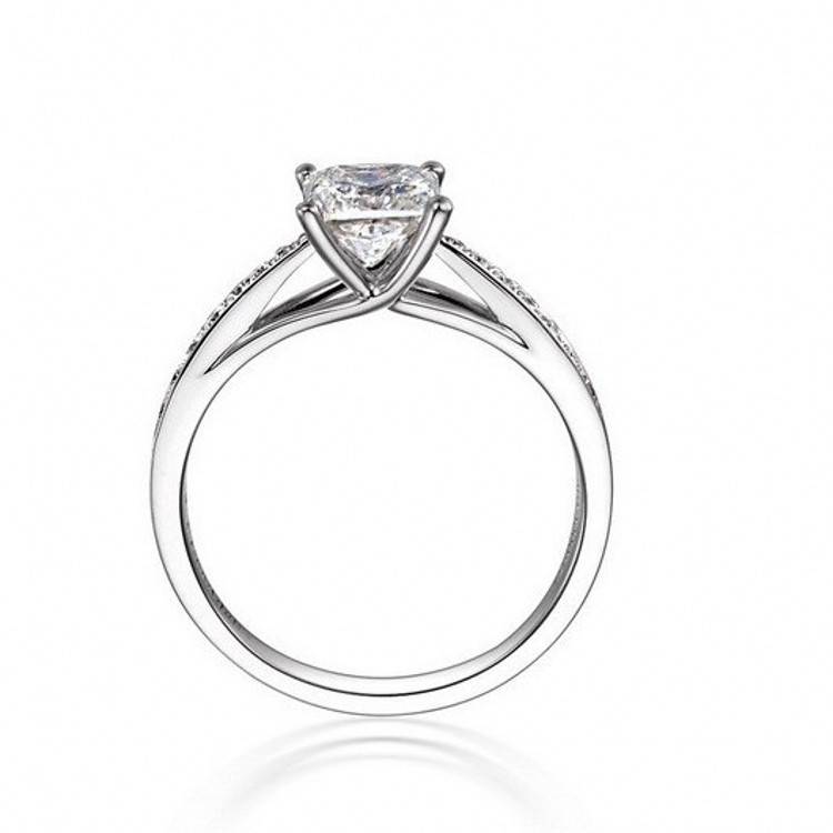 The classic look of our engagement ring is enhanced by its simple 4 prong setting and glimmering stone in princess cut. The band is thin, adorned with pave stones on the top half and very comfortable to wear everyday.Made entirely in 925 sterling silver the ring is stunning and very feminine.
