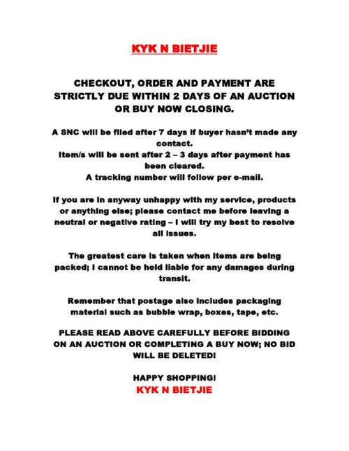 R65.00 Standard shipping applies to orders under R100.00, in most areas in South Africa. R35.00 Standard shipping applies to orders over R100.00. Some areas may attract a surcharge surcharge. This will be calculated at checkout if applicable. Check my rate