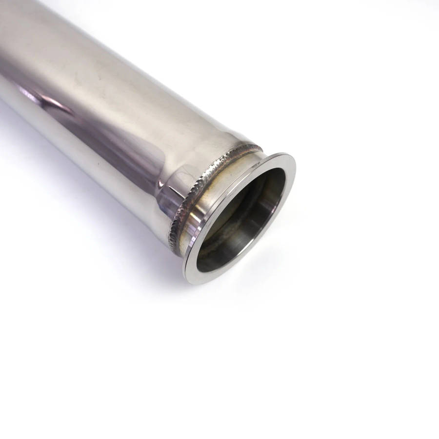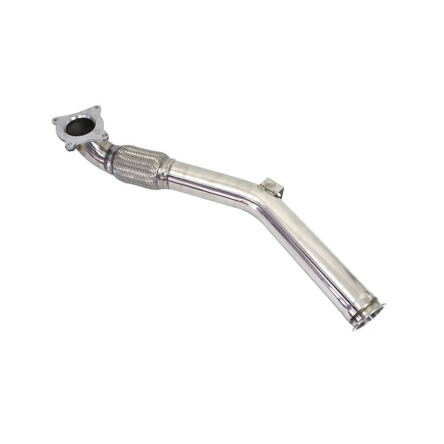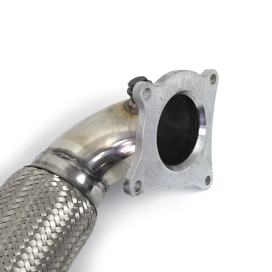 The Down Pipe has an enlarged pipe diameter at 3 in order to allow gasses leaving the turbo to flow at a more rapid rate than the restrictive OEM down pipe. This improved exhaust flow will result in more horsepower and torque by allowing the turbo to spool quicker and stronger. This also allows the turbo to work more efficiently with full boost being achieved lower in the RPM curve than before. Made from high quality stainless steel to resist corrosion and mandrel bent to ensure a smooth flowing surface, the Down Pipe will bolt directly to the OEM turbo using existing hardware for a factory-like fit. Integrated flex section ensures that under normal engine movement the down pipe will remain flexible to withstand such changes. The down pipe incorporates bungs for existing OEM sensors to retain proper engine management.