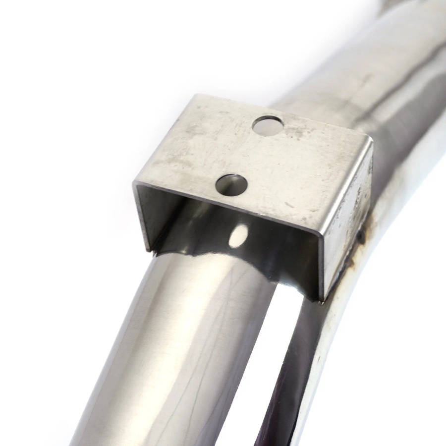CNC mandrel bent 14 gauge aluminized steel tubing CNC machined 1018 cold roll steel flange Professional TIG welded construction throughout Stainless steel braided flex section 304 Stainless steel