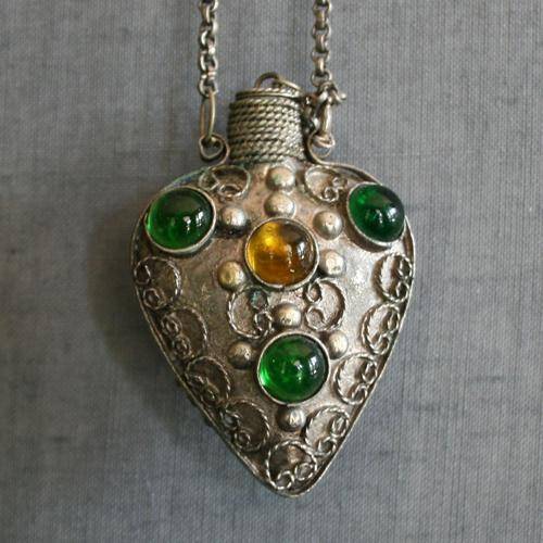 This pendant features a heart-shaped vial made of pewter and encrusted with yellow and green glass 'jewels', set on a pewter chain measuring 75cm. Beautifully aged and quite mysterious...