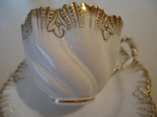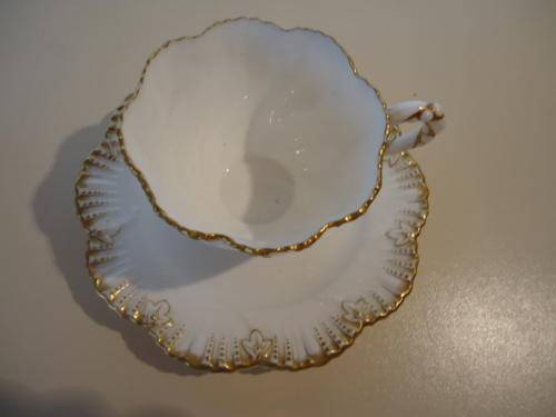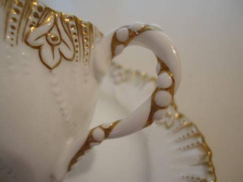 AN EXQUISITE COALPORT EIGHT LOBED TEA CUP HEAVILY EMBOSSED AND JEWELLED FINISHED WITH LAVISH GILDING ON A PURE WHITE GROUND. THE SAUCER IS ACTUALY A BISCUIT PLATE AS THERE IS NO WELL FOR THE CUP AND IT IS FRACTIONALY SMALLER THAN THE SAUCER.