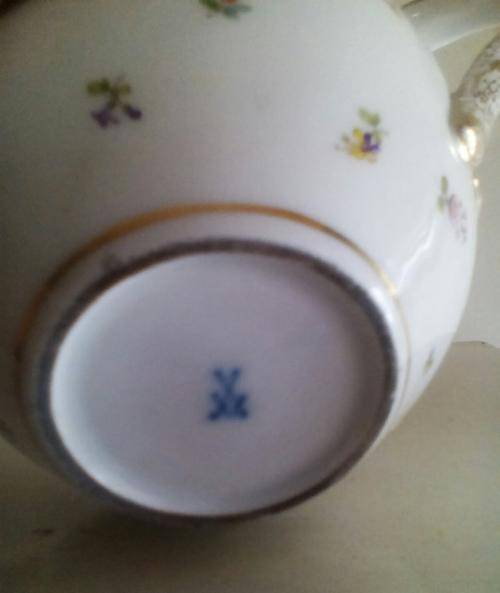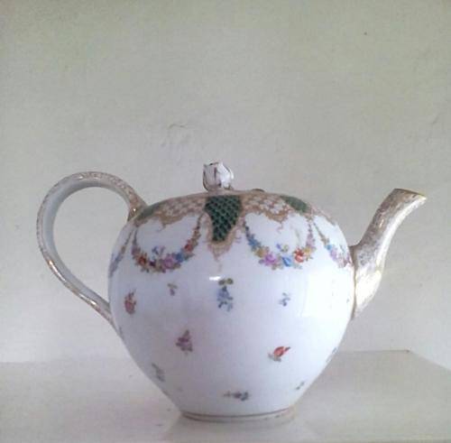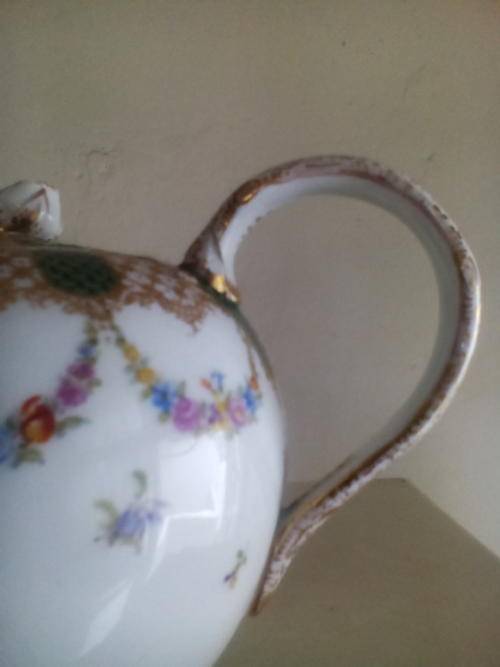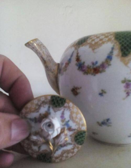 Exceptionally fine quality teapot by Meissen. Handpainted throughout with flowers, swags, green fish scale panels and various other decorative details in gilt. Stands 100mm high. Crossed swords mark.