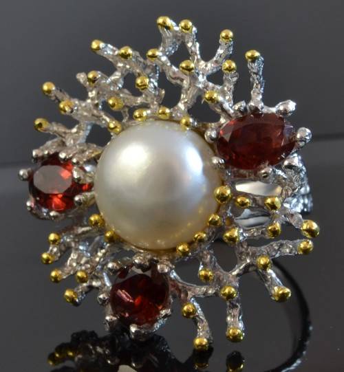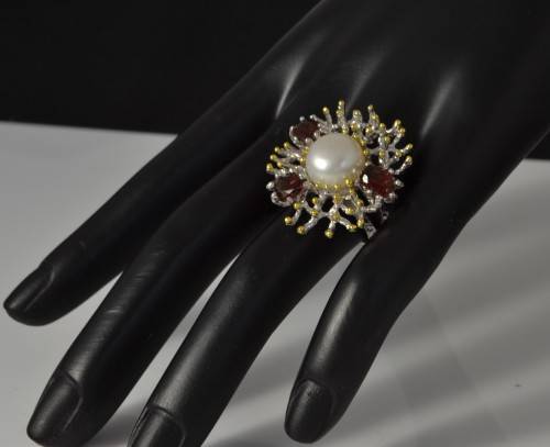 GORGEOUS REAL GARNET AND FRESHWATER PEARL TWO TONE RING SIZE 7
