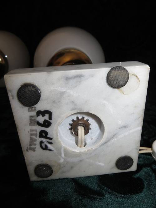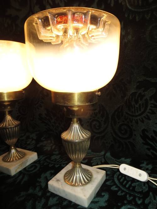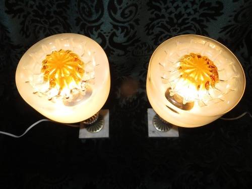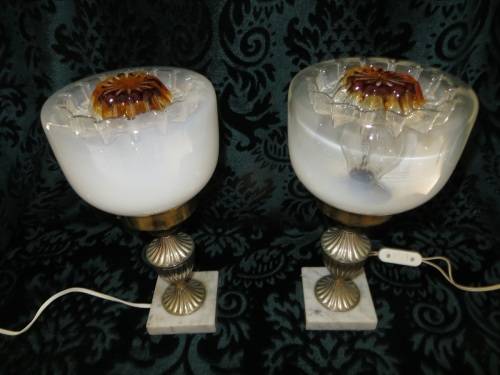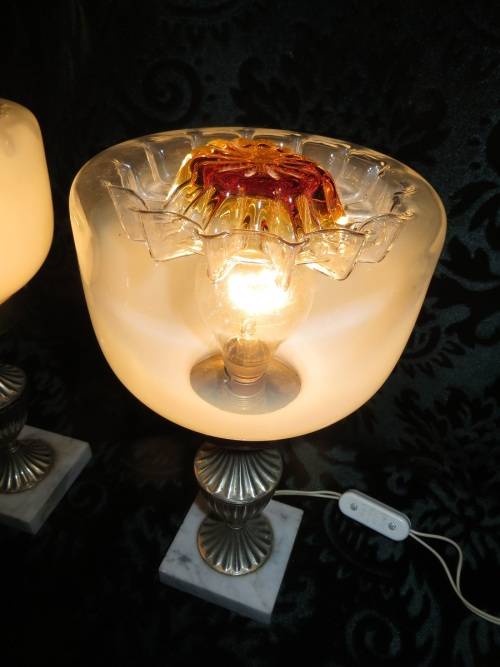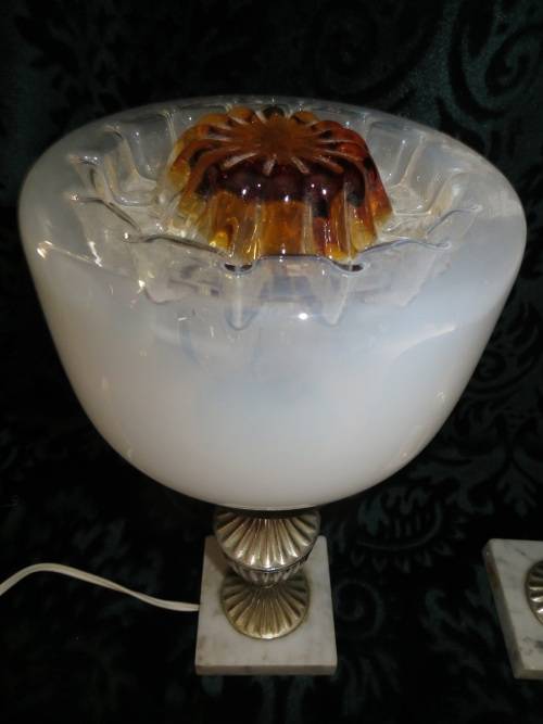 The most beautiful exquisite marble base glass table lamps I have seen. Has two different coloured glass on the shades. The bases are made from marble and stamped (Made in Italy).