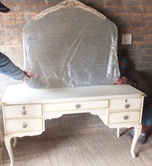 AWESOME RETRO 19i40's EXQUISITE DRESSING TABLE WITH FIVE DRAWERS, QUEEN ANNE LEGS AND AN INCREDIBLY BEAUTIFUL MIRROR WITH GOLD BEADING IN EXCELLENT CONDITION,,,,,,, SEEING IS BELIEVING. ORIGINAL HANDLES ... SO AWESOME. Dimensions are length 140cm, width 48cm and height 75cm. Can be collected by purchaser or delivered at a price of R350 dependent on location in Jhb area. See all the photos to appreciate both the beauty of the dressing table and the mirror (the bubble wrap is just for protection .... it is in perfect condition.