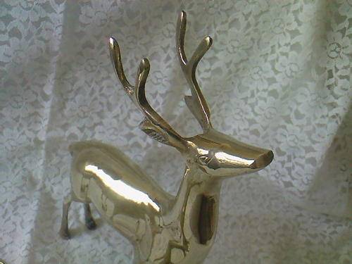 This is just the most graceful pair of deer in gleaming brass. He stands so proud and tall with those beautiful horns held high, while she glances at him shyly. He measures 30cm to the top of his horns, and 23cm from nose to tail. She measures 18.5cm to the highest point, and 25cm from nose to tail. There is absolutely no damage to this gorgeous pair, and together they weigh in at nearly 2kg!
