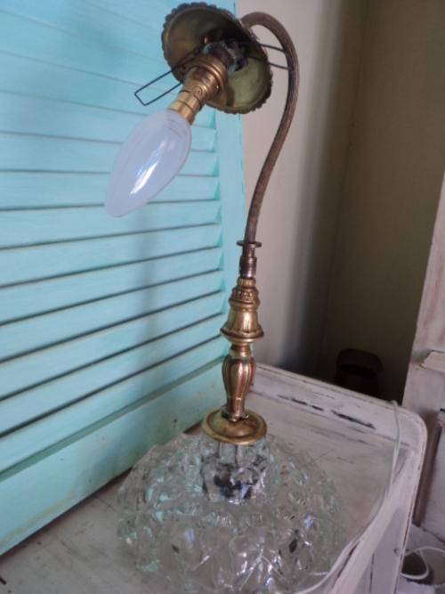 Exquisite goose neck brass and cut glass lamp!!!!The lamp is in working conditions....Please note: Does not have the sconce but they are not hard to find!!!! Have fun funding the perfect accessory for this stunning decor lamp~~~~Glass base has no cracks and chips, ornate brass parts !!!!
