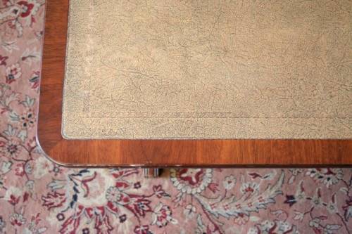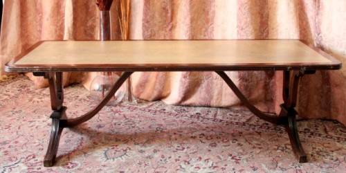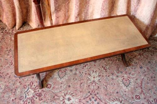 This exquisite vintage "Duncan Phyfe" inspired mahogany leather inlay top Lyre-harp leg coffee table is in gorgeous condition. This exquisite coffee table has been fashion on the incredible furniture produced by Duncan Phyfe in the late 1700's and early to mid 1800's and revived in the 1940's. The coffee table measures 122cm long x 48cm wide x 40cm high. There is minimal/ normal age and usage related wear and tear and the beautiful green leather inlay top is in great condition - there is just the right amount of wear!! This is a beautifully made table. Please view the pics carefully to fully appreciate this stunning Duncan Phyfe revival coffee table and to confirm the condition.