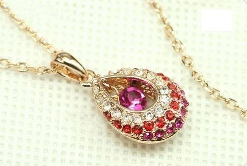 EXQUISITE YELLOW GOLD TONE TEAR DROP CRYSTAL NECKLACE - RED WITH PINK AND WHITE CRYSTALS