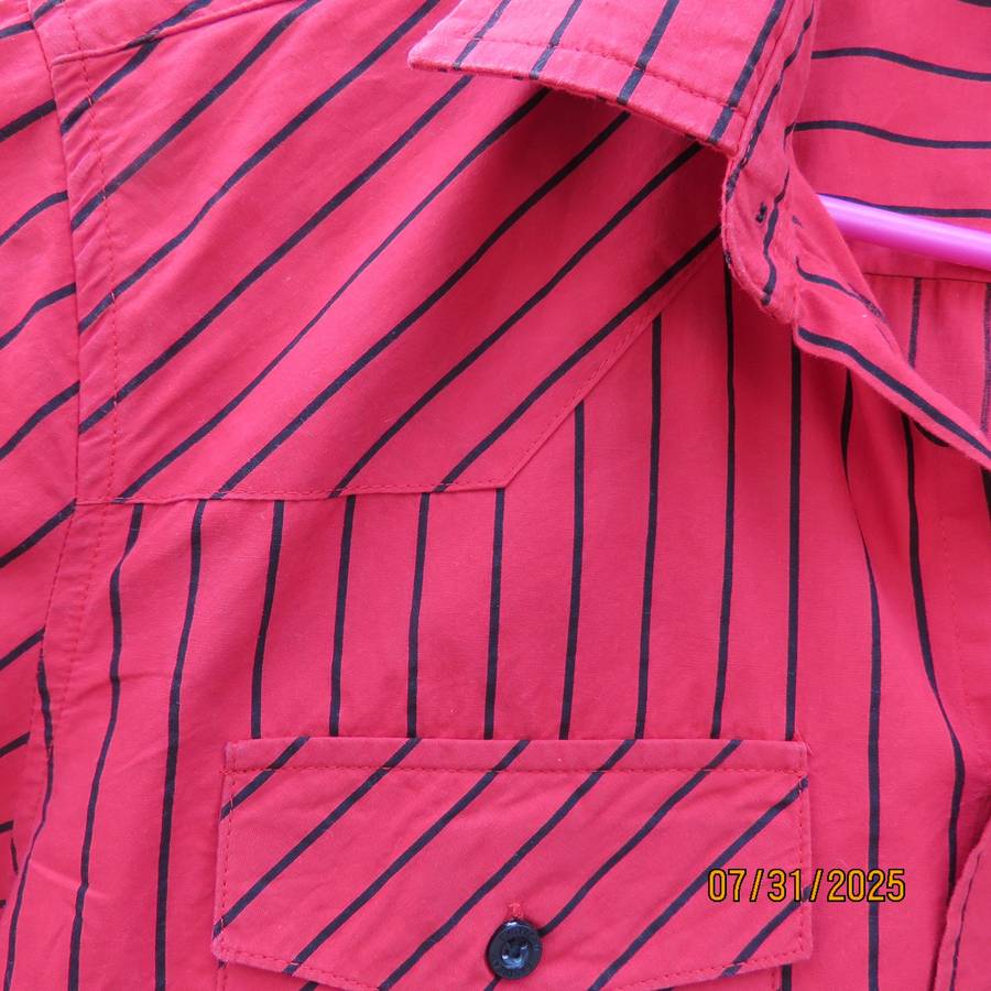 EXSTREAM men's long sleeve shirt in dark red with thin black vertical black stripes. Two front pockets. Yoked front and back. Sleeves can be worn in roll up fashion. Size medium. In cotton fabric. As new condition.