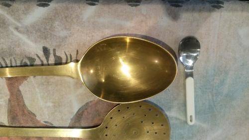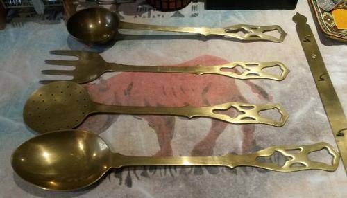 gorgeous large wall mounted brass rack with 4 utensils I put a teaspoon to compare - stunning décor for an upmarket kitchen to hand next to a fireplace - price excl shipping but we can quote if needed - thanks for looking and ask if questions