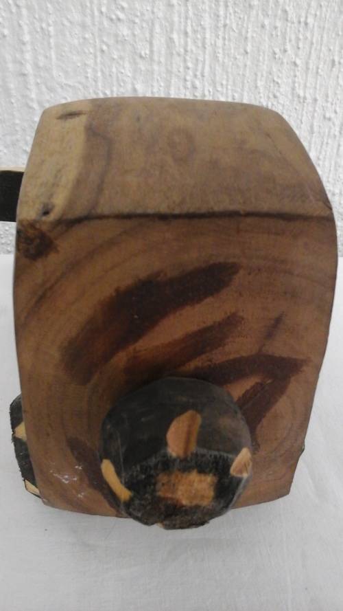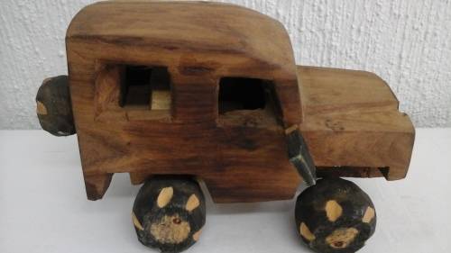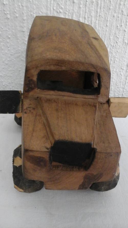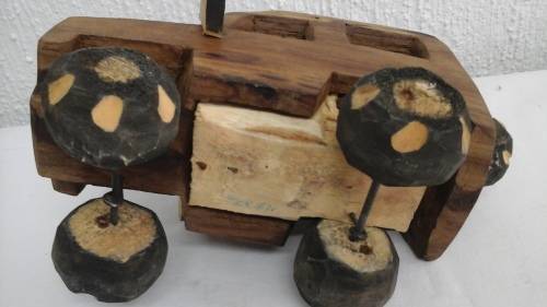 THIS FANTASTIC WOODEN PIECE HAS BEEN CARVED TO LOOK SIMILAR TO A JEEP. IT IS BASICALLY BROWN IN COLOR WITH BLACK TRIMMING.