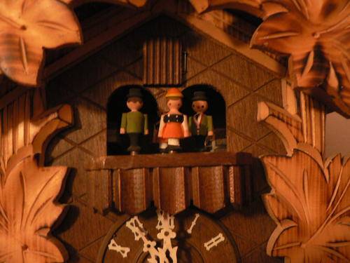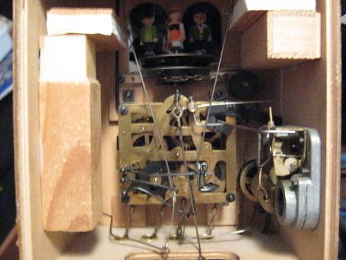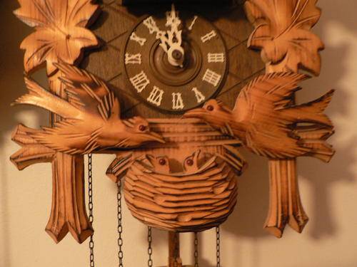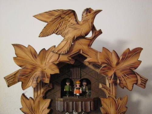 They say a picture speaks a million words. And here is the proof. A Beautiful Musical Cuckoo with the feeding bird theme at the bottom. The two birds, at the bottom of the clock moves up and down, feeding the chicks in the nest, when the clock cuckoo's. When it finishes, the music starts playing and the figurines on top rotate. This lovely clock has been serviced and is in perfect over all condition. It's driven by three iron weights and is fitted with a Regula German movement and a very good Swiss Music Box. This beautiful peace measures 38cm from top to bottom and and 30cm in width. This is a lovely clock for the collector and is very rare. It cuckoo's and plays music every half an hour and on the hour.