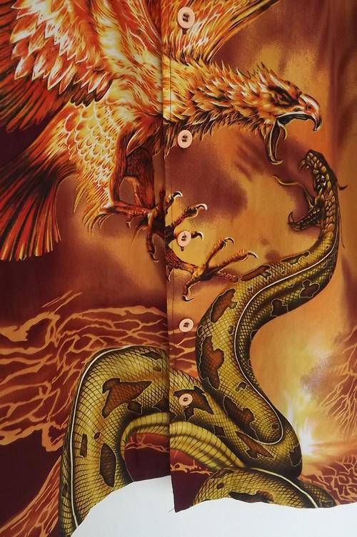 Eye-Catching Men's Shirt with Eagles and Snakes in Fiery Colours in size Large - Chest 125cm
