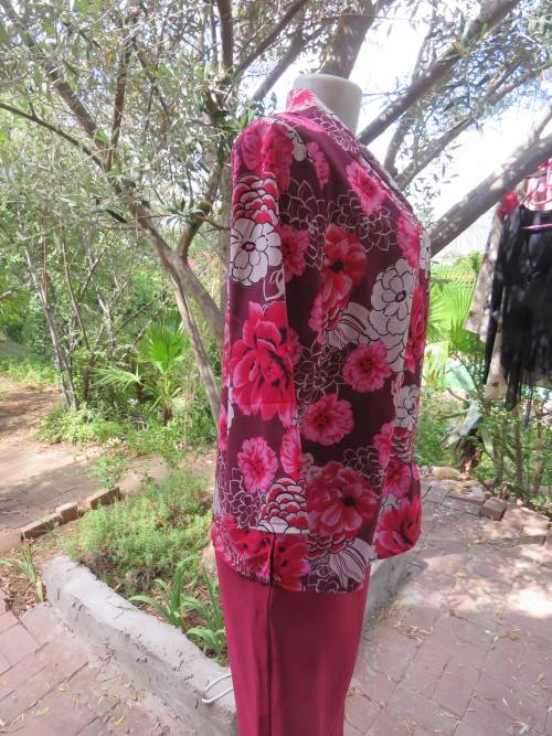 Eyecatching bold floral top in 100% wash + wear polyester by CASUAL AMERICAN.In burgundy,red and pink.Button down with open collar and elbow length sleeves.Size 38/14.As new