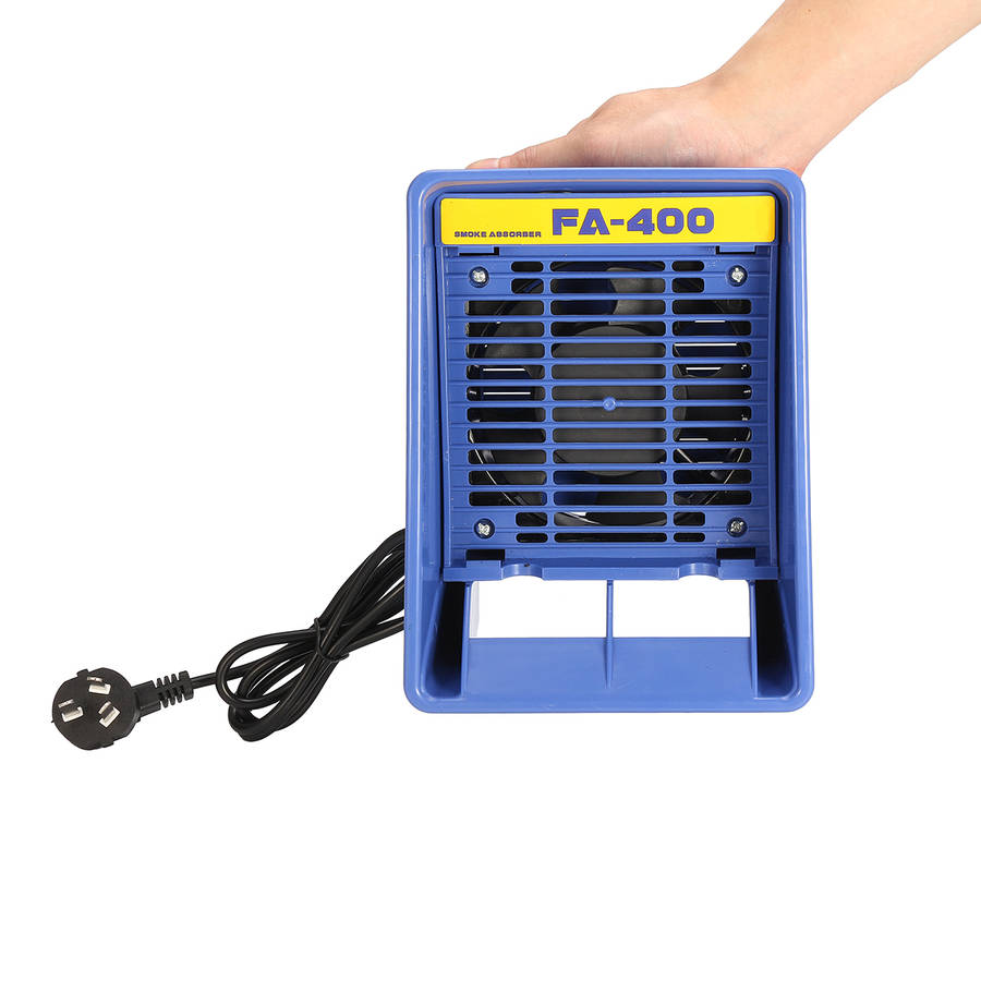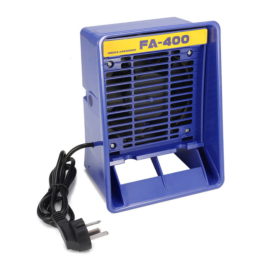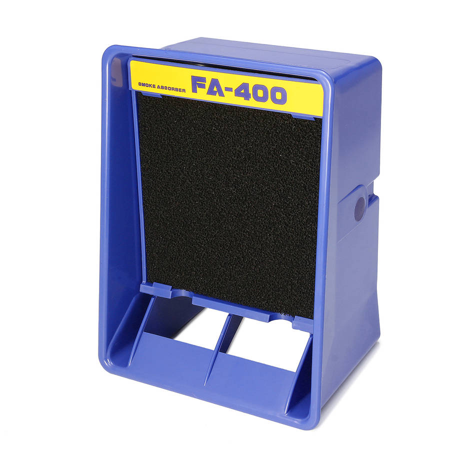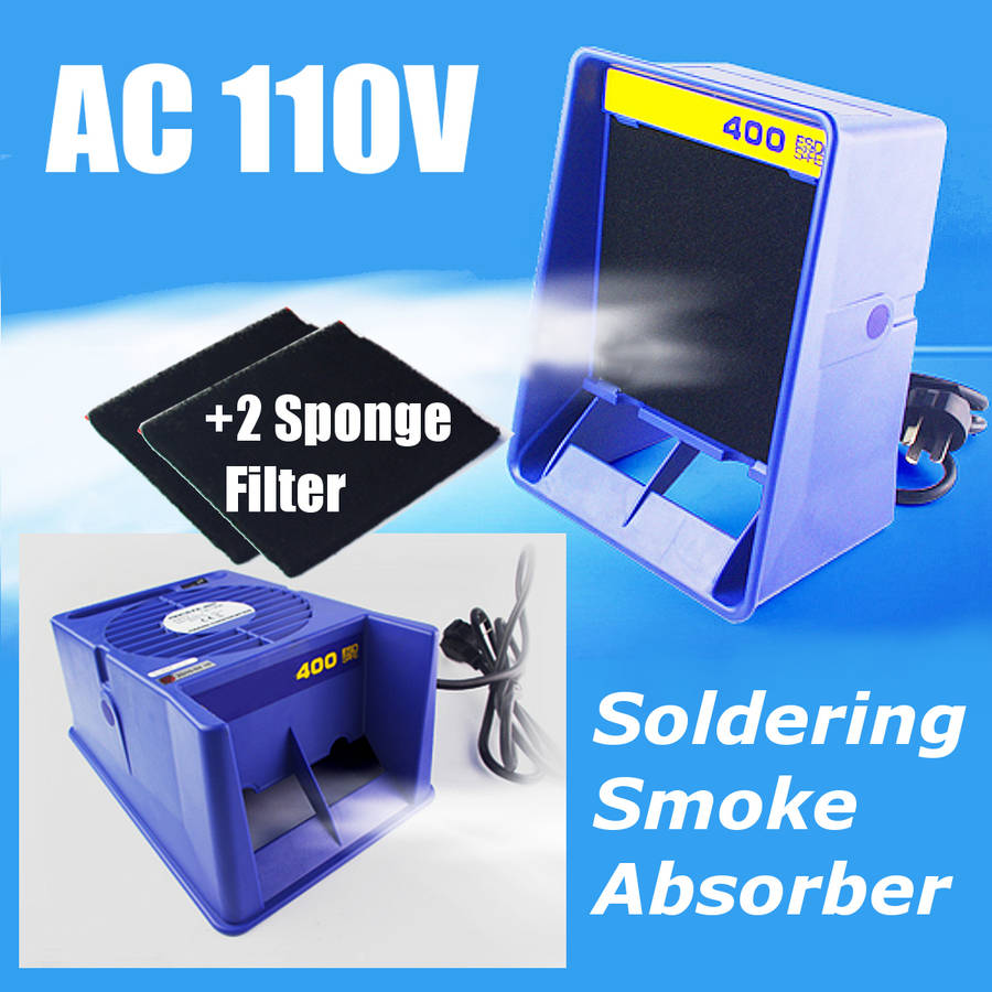 Breathe easy with the Smoke Absorber bench top smoke absorber. The Smoke Absorber removes soldering smoke and fumes quickly, safely and efficiently. The unit can be used in a vertical (standing up) position orlow-profile position (laying down.) When used in the low-profile (laying down) position, efficiency and air flow is increased by approximately 2.6 times. Unit is made of non-sloughing static dissipative conductive material and operates quietly. Standard activated carbon filter (PN: A1001) absorbs up to 80 percent of the odors from the air and is easy to replace. Can be used vertically (upright) or horizontally/low profile (laying down). Uses existing 493 filters and accessories. ESD-safe by design. Specifications: Voltage: AC 110V Power Consumption: 13W Color: Blue Absorption Capacity (w/o filter): Approx. 1.07m3/min. (37.79ft m3/min.) Outer Dimensions: 155 x 215 x 120mm Cable length: 2.6m Package Included: 1 x Soldering Smoke Absorber 2 x Sponge filter