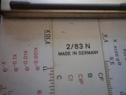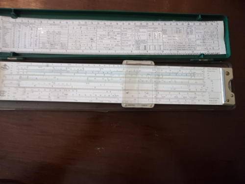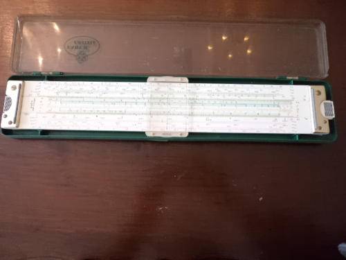 Shown New, in the factory box, with clear/green display case and manual. Spectacular plastic body rule with many line cursor (with tension adjustment), two color (red/dark green) scale markings, trademark mint green accent stripes on primary scales, over-range scale extensions, expanded trig and log log scales, dual square root/square root 10x scales (w), pythagorean scale and folded scales. The rule is self documenting on right hand side for all scales. Features heavy end braces with rubber anti-skid risers (prevents cursor damage when set on a destop) This rule is an outstanding Faber-Castell rule, and is made in an even larger body size and with more capability in the 2/83N version.